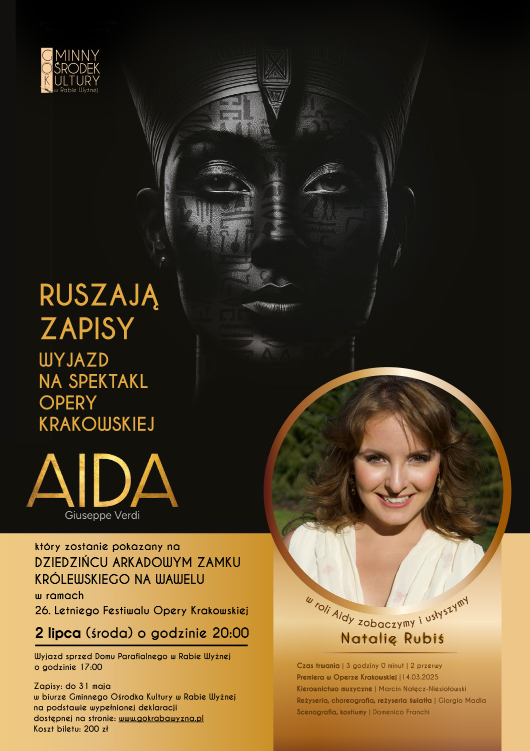 Ruszają zapisy na spektakl Opery Krakowskiej Aida Giuseppe Verdiego, który odbędzie się 2 lipca (w środę) o godzinie 20:00 na Dziedzińcu Arkadowym Zamku Królewskiego na Wawelu w ramach 26. Letniego Festiwalu Opery Krakowskiej. W rolę Aidy – etiopskiej księżniczki wcieli się Natalia Rubiś. Zapisy do 31 maja w biurze Gminnego Ośrodka Kultury w Rabie Wyżnej na podstawie wypełnionej deklaracji dostępnej na stronie: www.gokrabawyzna.pl, koszt biletu: 200 zł.