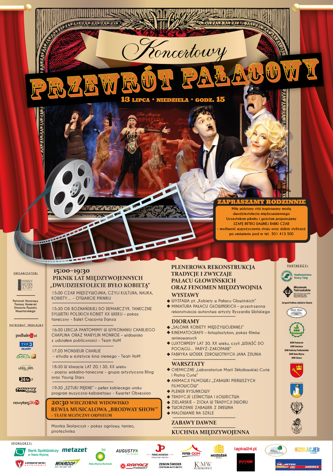 Po raz kolejny na skwerze przy Pałacu Głowińskich w Rabie Wyżnej, już 13 lipca obędzie się Koncertowy Przewrót Pałacowy – i tym razem…  w nowej, spektakularnej odsłonie. W tym roku motywem przewodnim  wydarzenia jest fenomen międzywojnia i wpisana weń rola kobiet, a towarzyszyć mu będą piknik lat międzywojennych i bogaty program odsłaniający zarówno postęp kulturalny epoki jak i sylwetki kobiet XX wieku ze szczególnym ujęciem roli kobiet związanych z Pałacem Głowińskich.  Przygotowany został specjalny performance w formie pokazów tanecznych, komediowych widowisk w estetyce kina niemego, popisu muzyczno-kabaretowego zwieńczony wieczornym widowiskiem – Rewią Musicalową „Brodway Show”.