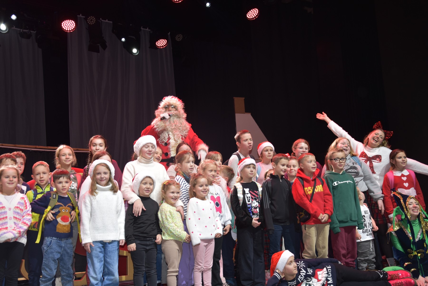Kiedy Mikołaj wkroczył na scenę, radość dzieci była nie do opisania. Najmłodsi zostali zaproszeni na scenę i następnie obdarowani prezentami – aż dwa wielkie worki pełne świątecznych niespodzianek trafiły w ich ręce. Nie zabrakło też pamiątkowego zdjęcia, które zatrzyma w kadrze ten wyjątkowy, pełen uśmiechów moment. W drodze powrotnej mikołajowe pomocnice z GOK-u – panie Nina i Agnieszka zadbały o to, by magia trwała dalej, rozdając upominki w autokarze.