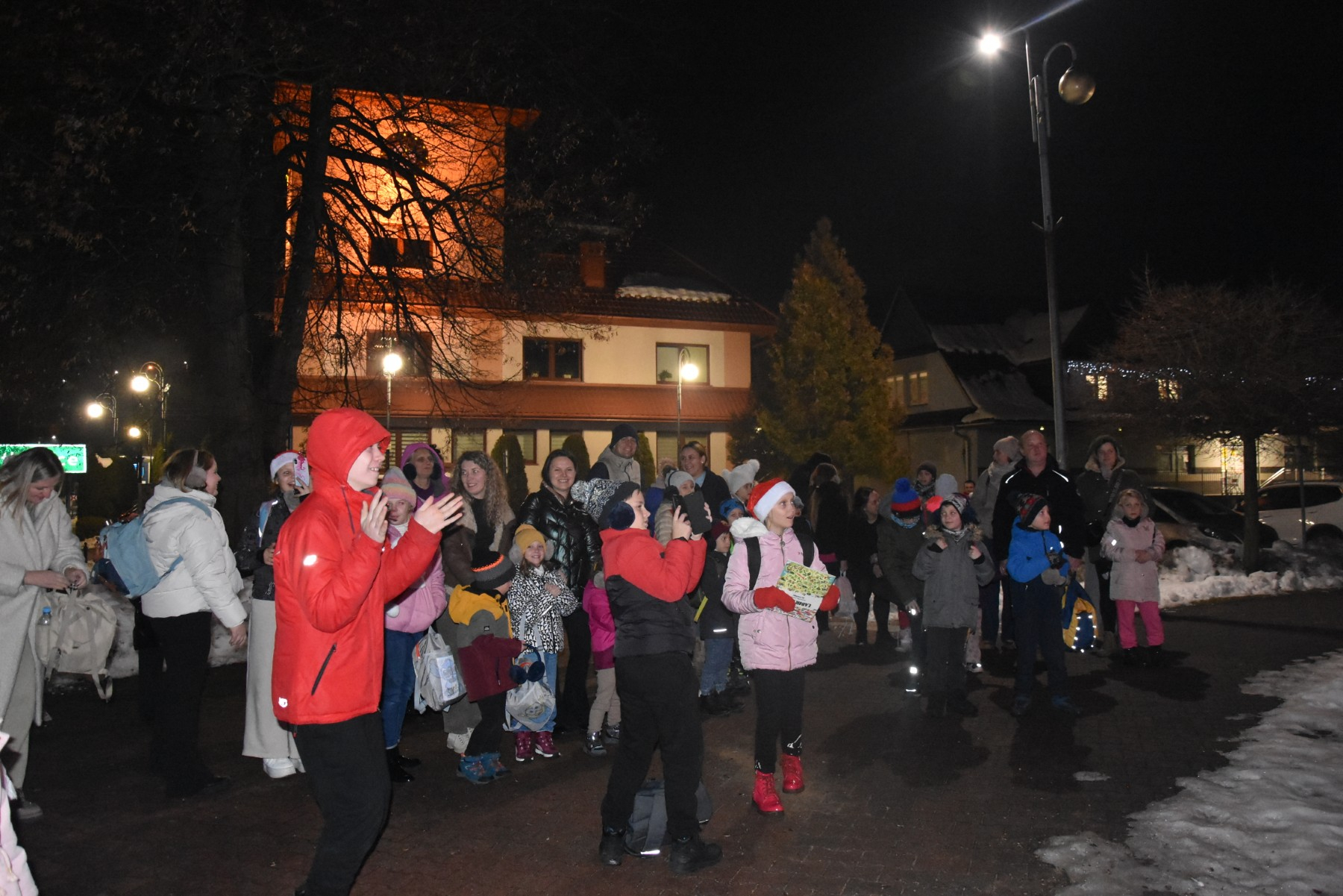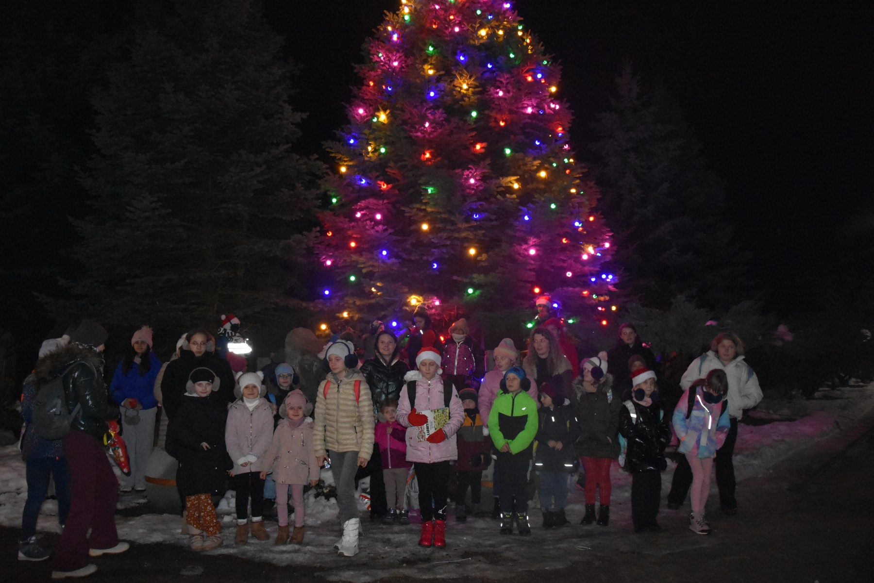 W wyjeździe udział wzięły zarówno dzieci, jak i rodzice – dzięki temu całość miała prawdziwie rodzinny, ciepły i pełen bliskości charakter. Radosna atmosfera nie opuszczała uczestników aż do samego powrotu. Gdy autokar dotarł z powrotem do Raby Wyżnej, w zimowej, wieczornej scenerii wszyscy wspólnie podeszli pod choinkę stojącą w centrum miejscowości. Tam odbył się wyjątkowy moment – uroczyste rozświetlenie świątecznego drzewka, które tradycyjnie będzie zdobić Rabę Wyżną przez cały okres Bożego Narodzenia, przypominając o wspólnym świętowaniu i wyjątkowej mocy bycia razem. To był dzień pełen wzruszeń, uśmiechów i świątecznej magii, który na długo pozostanie w pamięci najmłodszych mieszkańców naszej gminy.