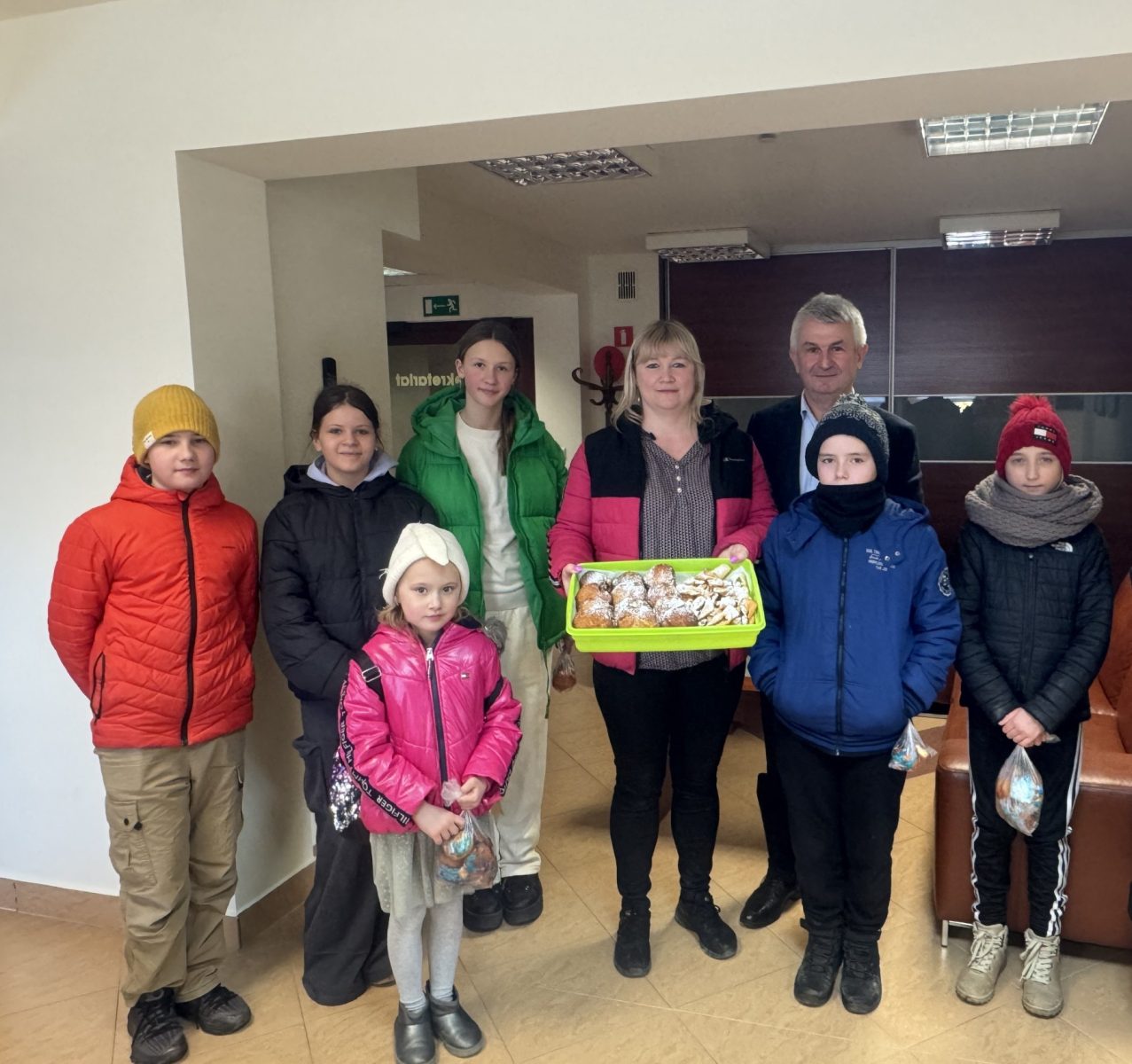 Po zakończonych warsztatach dzieci wraz z opiekunami udały się z delegacją do Urzędu Gminy, gdzie wręczyły przygotowane wypieki jako słodki poczęstunek. Była to miła niespodzianka oraz okazja do podzielenia się efektami wspólnej pracy.